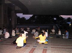 体育馆的走廊很宽,学员们围成一大圈,每天五套功法一步到位。每星期三晚上有学法组,每星期二与星期五晚上部份学员会到麟洛炼功点,和他们一起学法、交流、切磋,大家在一起都很祥和、愉快。