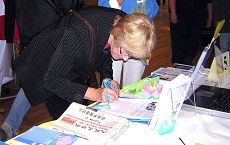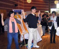 十四日下午,展览会的主办者给法轮功学员提供了一个教功的场所,让有兴趣学习法轮功的人们可以感受一下,法轮功学员简单介绍了一下法轮功并教炼了几个动作,人人都感觉到很强的能量。其后一位女士说,“今天遇到法轮功太好了。几年前我出游到西班牙,有一天早晨我出去散步,那时太阳刚要升起,我看见几十个人沐浴在晨曦中,他们正炼着法轮功,哦,那景象太美了,绝对是超尘脱俗的,可惜那天我必须得离开。请给我你们的联系方式,我一定要学。非常谢谢你们。”