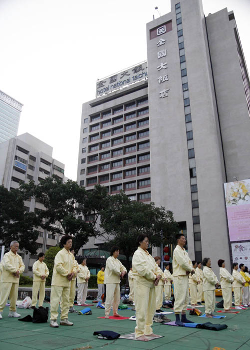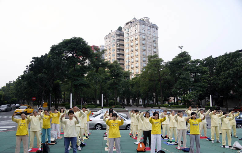 二零零六年七月开始,我们的炼功点从市民广场移到全国饭店前的绿园道。经过交流,我们尽量穿着印有“法轮大法”的黄色上衣,希望中国大陆游客拍照回国后,能使受中共谎言蒙蔽的中国人看到台湾有许多法轮大法的修炼者。每逢星期天,其它炼功点的学员会一起参与集体炼功,汇集更强大的正念之场。