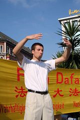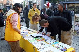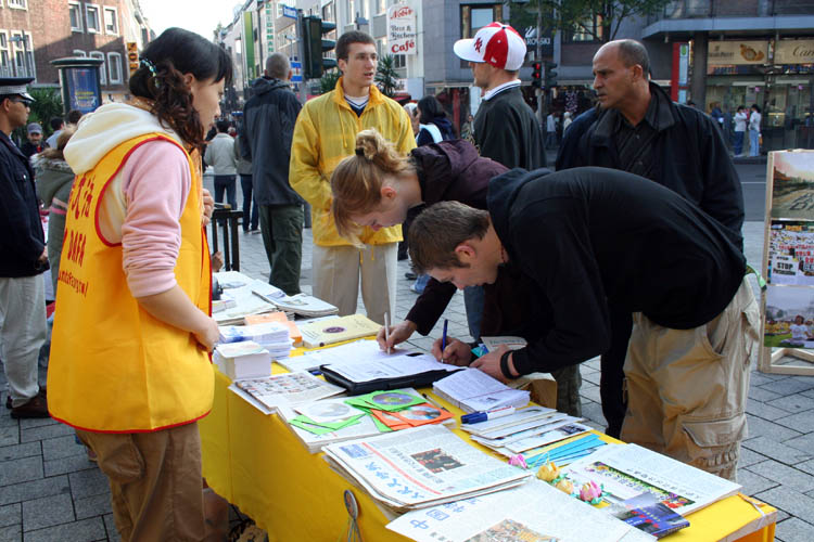 二零零六年十月十四日周六,法轮功学员在亚琛市中心商业区举办了洪法活动,向人们介绍这一源自中国的传统修炼功法,并揭露中共对法轮功修炼者的残酷迫害