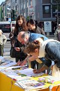 十四日风和日暖,在挤满了散步、旅游或购物的人群中,法轮功学员搭建的揭露中共活摘器官的模拟手术台和演示酷刑迫害的牢笼,吸引了大批行人驻步观看。人们纷纷索取真相资料并在写给德国总理默克尔的请原信上签名,要求声讨中共。