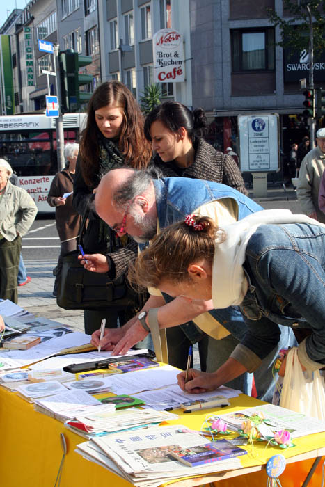 人们在写给德国总理默克尔的请原信上签名,要求声讨中共