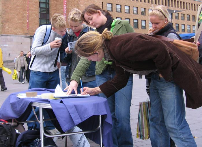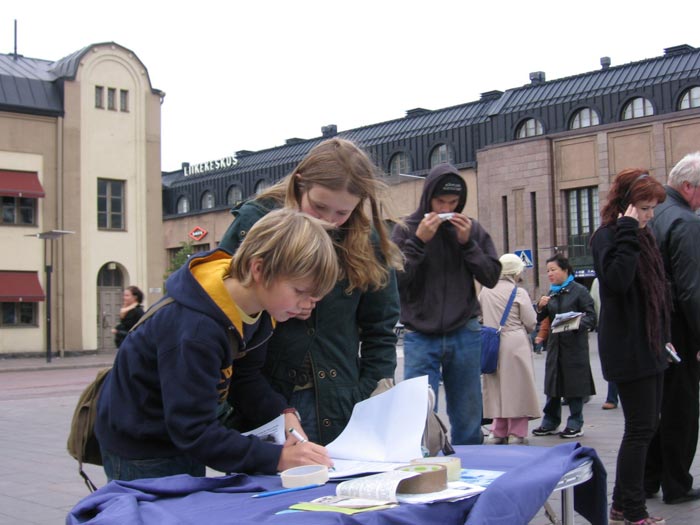 【明慧网二零零六年十月二十日】今年正值芬兰是欧盟轮值主席国,而欧盟——中国的人权对话即将在北京举行。二零零六年十月十四日,芬兰法轮功学员相约再次来到人流最多的赫尔辛基火车站一侧,向芬兰政府和民众揭露中共七年来残酷迫害法轮功学员的真相,特别是让人神共愤的活体摘取法轮功学员器官罪行。