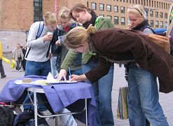一位看似七十多岁的老奶奶,认真看了资料和展板,接着对学员说:不能沉默,要反抗,我支持你们!说着就去签名。