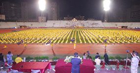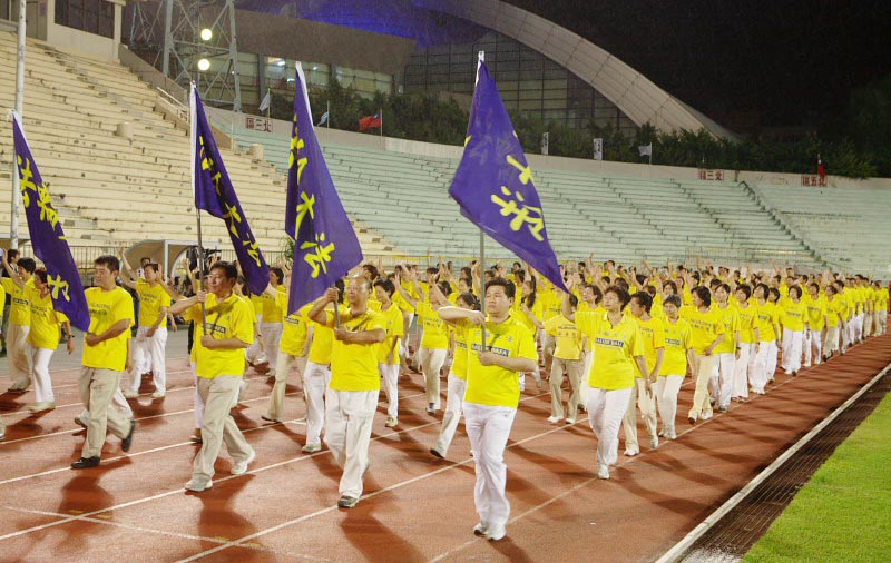 ![]() 在闭幕大会上,最受瞩目的二千余名法轮功学员表演进场,声势浩大 |