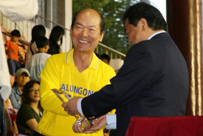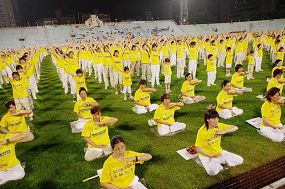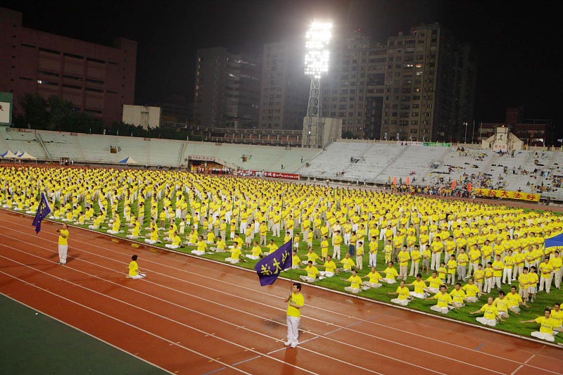 当法轮功二千余学员一出场,一片黄色人海充满整个田径场,随着祥和的炼功音乐,或老或少的男女学员全神贯注、整齐划一的动作,立刻赢得在场所有观众的喝彩。