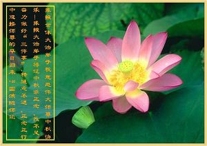 我们一定不辜负您的慈悲普度,遇每一件事情都会把自己作为一个炼功人,按照“真、善、忍”严格要求自己,修好自己,救度众生,完成历史的宏愿,跟师父回家。