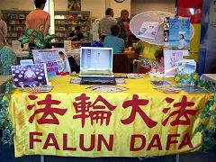 在众多的展台中,法轮功的展台特别引人注目。美丽的各色纸莲花,金黄色的“法轮大法”横幅,电脑中播放的法轮功教功录像和背景音乐中播放的“普度”和“济世”,给路过者祥和美好的感受。