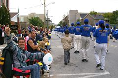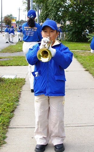 今年九岁的Jeffrey是乐团年龄最小的小号手,他是第一次参加乐团的游行,走完全程到达终点后,当笔者问他累不累时,他说:“当走了四分之三的路程时,我开始感觉有点累了,但累也要坚持到底。我坚持走完并一直演奏到底。”他还对笔者介绍说:“两个月前看着妈妈在练习,我很感兴趣,就要妈妈教我吹,一个月后我就开始自己练,现在我能吹四首曲子了。”