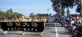 法轮功学员的队伍由横幅、腰鼓队、花车和仙女队组成,将法轮大法的美好及祥和展现给世人。整个游行路程两侧围满了观众,一路上司仪不断的向沿途的观众介绍法轮大法,花车队伍所到之处,不断的赢得阵阵掌声及欢呼声。有的观众脱帽向队伍致敬;有的竖起大拇指叫好;还有几个小孩子合十致意,并高声说:“法轮大法”;有几个中国观众更是被惊呆了,一直目送着法轮大法的队伍。