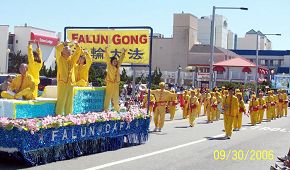 代表中国传统文化的法轮功游行队伍是第四次受邀参加海洋节游行。他们身着金黄色调为主的炼功服装,在阳光下格外醒目。莲花点缀的花车简洁但有特色,当学员在上面表演五套功法时,花车的评委连说“很好很好”。游行前,一个小女孩专门跑到花车的“法轮大法”几个大字下面,要求妈妈摄影留念。由法轮功学员组成的腰鼓队,年纪相差很大,但大家着装统一,相互配合,鼓点整齐。游行队伍所到之处,人们报以热烈掌声,法轮功学员们也微笑面对观众致谢。很多观众随着音乐“法轮大法好”和“喜庆”的节奏,即兴起舞。