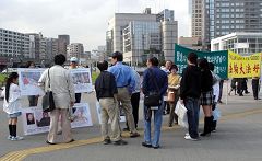 学员们打出了“法轮大法好”、“紧急呼吁调查活摘法轮功学员器官的内幕”等横幅,同时也展出了一些触目惊心的揭露中共迫害法轮功的图片。