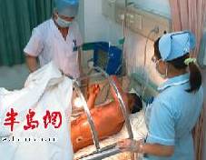 2. 医院里的秘密 具有烧伤医护常识的人都知道:大面积烧伤的病人创面要尽量暴露,保持通风干燥,否则很容易造成化脓感染。而焦点访谈中的“自焚者”却全身被包扎的密不透风,是想掩盖什么?再看看青岛电视台、半岛都市报等报道的2005年6月14日,青岛市打工青年王某被闪电烧伤,在医院抢救现场的照片。从照片可见到,烧伤处暴露在空气中晾着。护理人员身穿卫生服,戴口罩以防感染。
