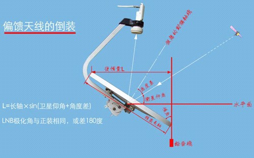 倒装偏馈天线调仰角的时候,软件计算出来的角度应加上20度,比如本地区收76.5的时候,软件计算的仰角是31度,在安装调试的时候应该调成53度多。因我们还没有试装过倒装天线,是在别的同修介绍经验的基础上整理的,仅供参考。