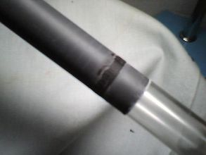 由于长时间的固定版式打印,定影膜两侧和中间容易形成厚厚的一层积碳,很难清理。(印品表现为两侧和中间纵向黑带字迹模糊)如继续使用很可能造成定影膜损坏。