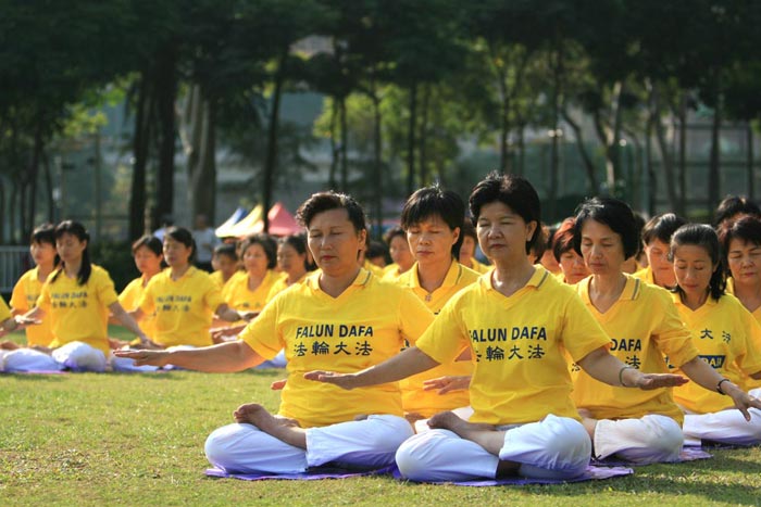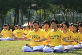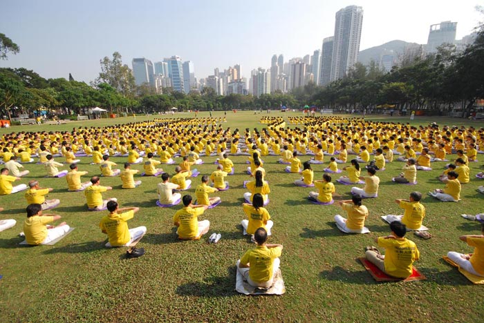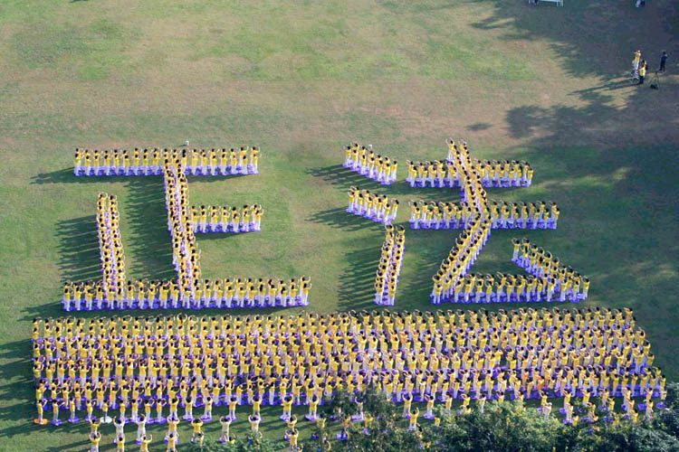 逾千学员在维园集体炼功,组成“正法”两个字。