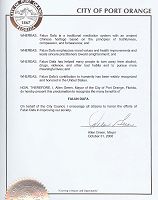 十一月十四日,佛罗里达州橙港市市长、副市长和市议员向法轮功学员颁发褒奖状,表彰法轮大法对社会的贡献。
