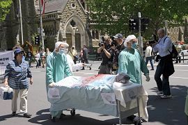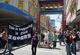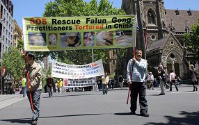 值得一提的是,负责保护游行队伍、维持交通的两位墨尔本警察,在游行前听学员介绍了法轮功被迫害的情况、大法洪传世界八十多个国家和地区、以及此次游行的目地,他们也在请愿书上签名,并主动提出和上级协商,改变路径,使游行经过各大媒体守候的酒店旁,这样主流媒体都能看到法轮功学员的游行,看到大法的真相横幅和揭露迫害的真人模拟演示。