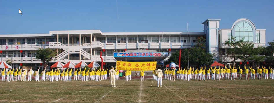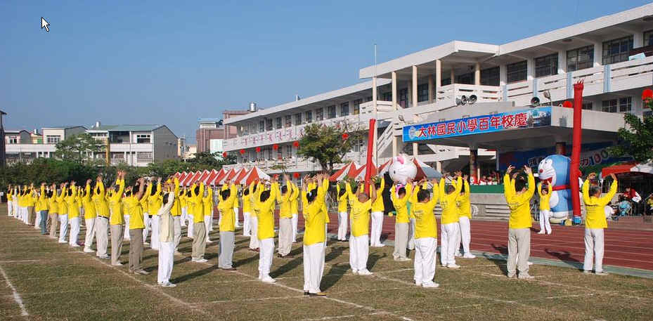 当天是嘉义县大林国小创校一百周年的校庆运动会,法轮功学员接受学校邀请,在运动会前表演功法。