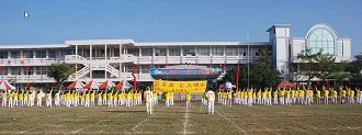 学员演炼第二套功法时,太阳的光辉已经洒遍整个操场,扩音器也适时播出法轮功的介绍:“各位贵宾好:现在大家看到的是法轮功的功法表演,法轮大法是上乘的佛家修炼大法,以宇宙最高特性‘真、善、忍’为修炼原则,包含五套缓慢、优美的功法动作,一九九二年由李洪志先生在中国长春传出。修炼法轮大法,只要反复通读《转法轮》,按照书中阐述的‘真、善、忍’标准要求心性的提高并辅以炼功,短时间就能收到意想不到的效果,直到返本归真。”