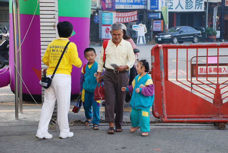 ![]() 法轮功学员在校门口发送简介 |