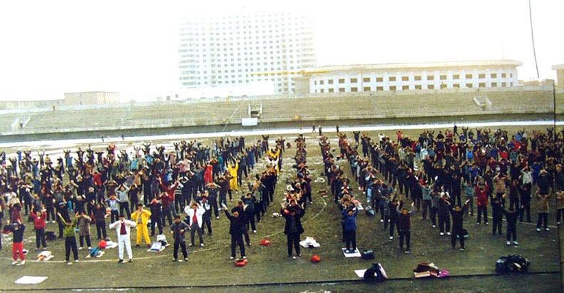 图片:九九年七二零前兰州大法弟子集体炼功学法的场面