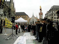 在《九评》发表两周年到来之际,连续三周以来,每周六法轮功学员都在慕尼黑马琳广场举办这样的活动,吸引了无数市民和游人关注。人们纷纷谴责中共对法轮功的迫害,很多人当他们得知法轮功学员征集签名,呼吁德国政府制止中共屠杀法轮功学员时,马上踊跃签名。