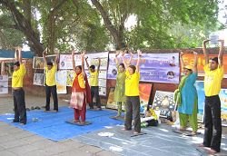 在中共领导人胡锦涛于二零零六年十一月二十一日到印度首都新德里进行四天访问前夕,印度大法弟子于十一月十九日来到印度首都新德里CONAUGHT PLACE 附近洪法,炼功,同时挂横幅,摆放真善忍画展,吸引了在现场不远处上千名进行抗议活动的西藏人士、附近的市民以及记者前来了解法轮功真相。