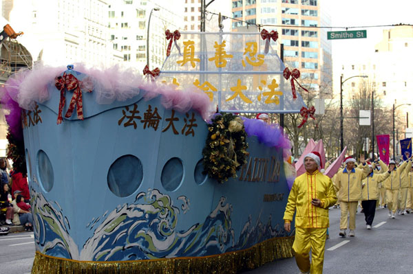 法轮功团队中长达四十英尺的“法船”型花车,在当晚的CTV节目预告中,被作为本次游行的标志之一在电视中播放。气势磅礴的天国乐团给观众带来了极大的震撼。