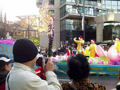 ![]() 法轮功的队伍阵容强大,多姿多彩 | ![]() 法轮功队伍受到观众的热烈欢迎,很多人拍照留念 |