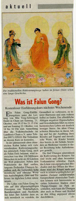 卡姆市当地几家报社对法轮功很支持,为学功班做宣传。其中《卡姆时报》(Chamland Aktuell) 在头版以“来自古老中国的智慧”为题详细介绍了中国传统的佛道两家的修炼以及什么是法轮功。这帮助卡姆当地的广大民众進一步感受到修炼大法的美好和纯正。