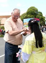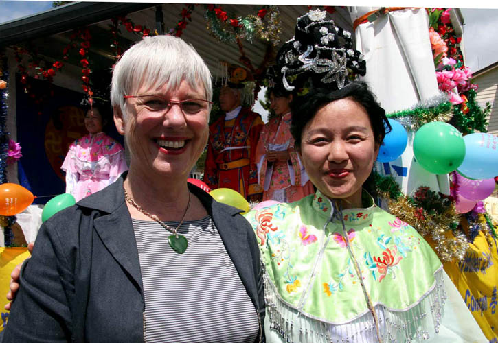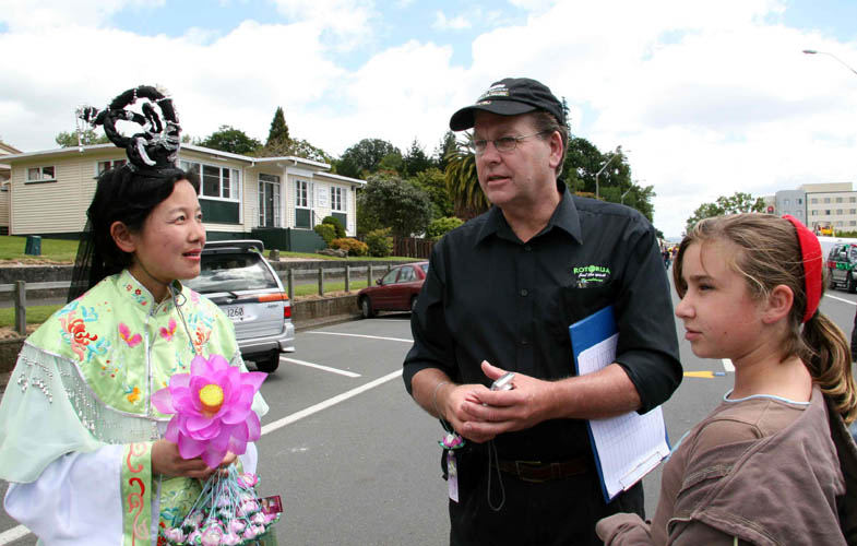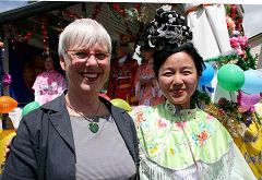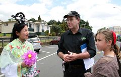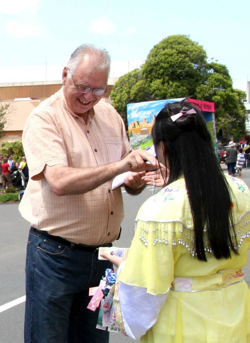 当市长和家人经过法轮大法学员的花车时,饶有兴致的与部份身着唐装的法轮功学员交谈留影,气氛十分轻松。