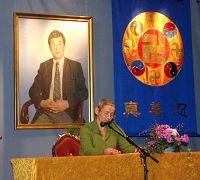 戴女士表达了她对爱尔兰政府帮助两名法轮功学员从中国的劳教所回到爱尔兰的感谢,其中的一人,刘锋先生在会议现场。