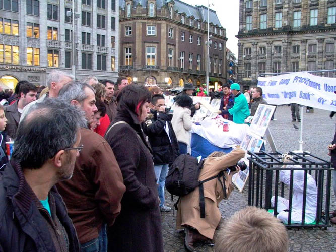 【明慧网二零零六年十一月二十九日】二零零六年十一月二十五日,来自荷兰与比利时的法轮功学员来到阿姆斯特丹市中心的水坝广场举行模拟演示,揭露中共活体摘取法轮功学员器官。现场还设有反酷刑展和图片展。