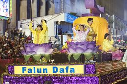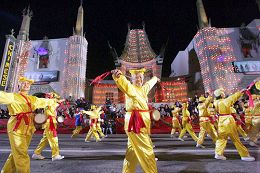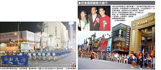 ![]() 刊登在洛杉矶时报好莱坞巡游专刊头条新闻图片。图注中说:来自洛杉矶、圣地亚哥、及旧金山的法轮功学员舞蹈表演者在Grauman's 中国剧院前。 |