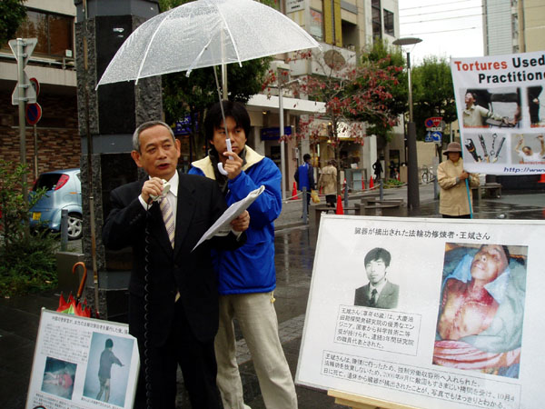 本次集会还邀请了前国会议员牧野先生发言,他冒雨赶到集会现场,首先介绍二零零二年参与营救被中共非法关押的法轮功学员金子容子时的情况,而后又配合模拟演示曝光现在中共非法摘取法轮功学员活体器官的惨烈事实。牧野先生的介绍,帮助更多的日本人了解了真相,了解了中共政权的残暴。