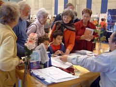 一位高个子西人,搀扶着一位老妇人,来到写书法的学员面前说:这位是我母亲,今天是她的生日,我们想请您给写上“真善忍好”,这将对我母亲是很有意义。在满足了心愿,拿到了写有“真善忍好”及生日祝福的条幅后,老人高兴的连连与学员握手道谢。