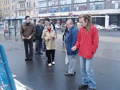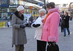 二零零六年十一月五日中午,时值“大纪元”网站退党人数超过一千五百万,芬兰退党服务中心和大纪元义工及法轮功学员,本周已是第二次出现在市中心火车站的人群中,向人们通报这个消息,并声援原山西省科技协会秘书长贾甲近日在台湾脱队决裂中共的义举;同时展示真相图片,揭露中共杀害八千万无辜的中国人民和七年来对法轮功学员灭绝人性的迫害。