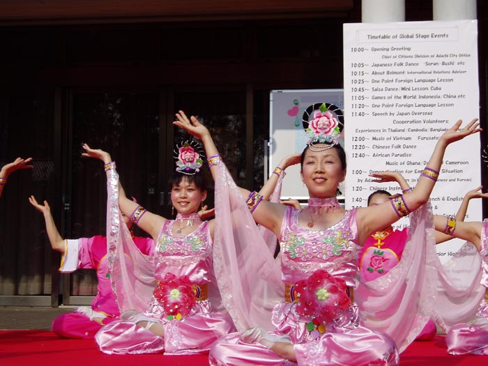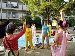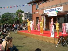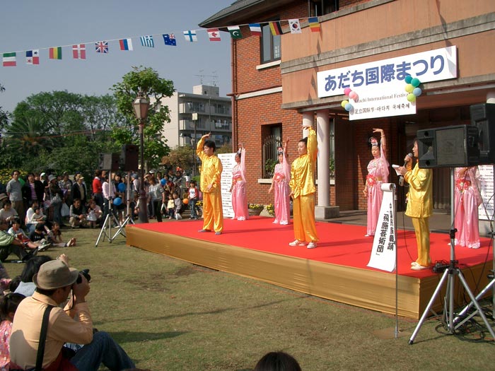 【明慧网二零零六年十一月七日】十一月三日,由日本法轮功学员组成的唐韵艺术团,参加了二零零六年东京足立区国际节演出,足立区是东京第二大外国人聚居地区,特别是中国人很多。国际节每年举行一次,每次都会有许多民族的市民来展示各自的服饰和文化。法轮功学员们华丽的服饰、精彩的歌舞、优雅的功法展示和纯净动听的炼功音乐,将纯正善良的能量赋予了在场的每一个观众。
