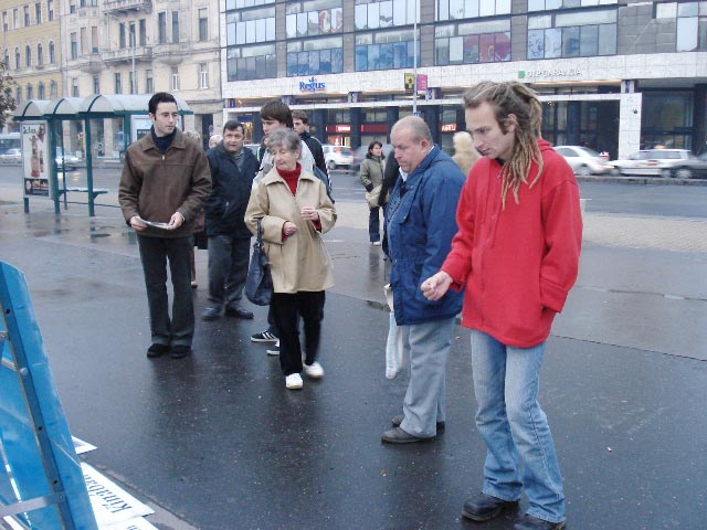 学员们摆出真相图片,发放传单,征集签名,并和路人交谈,讲述中共对法轮功学员犯下的人权罪行。许多人停下脚步认真倾听,或阅读真相图片。