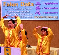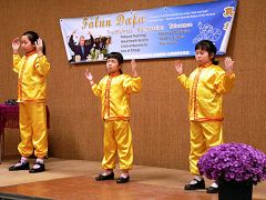 ![]() 法轮大法小弟子们在炼功 | ![]() 法轮大法小弟子们应邀在台上演示法轮功功法 |