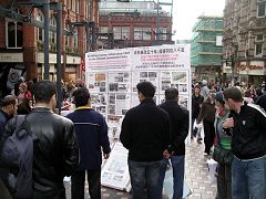 许多路人在展板前停下了脚步,震惊的看着法轮功学员遭受中共酷刑迫害的图片,这些触目惊心的折磨手段包括以竹签钉手指、水牢等等。在阅读内容说明后,人们自发的在呼吁终止迫害的请愿书上签名。这些请愿信将会被递交给英国政府,以促使制止中共非法侵犯人权的暴行。