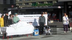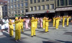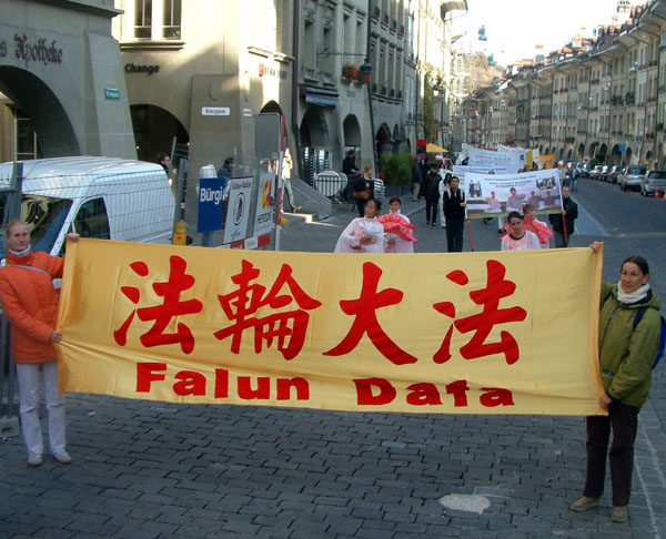 远远的就可以听见整齐的腰鼓声,间或穿插着阵阵“Schnell, Schnell,Schnell, aus der KPC(快,快,快,退出中共)”的呼声,没有激烈的口号,也没有喧哗嘈杂,和其它的游行队伍截然不同。很多漫步在瑞士首都伯尔尼市中心购物街的路人停下了脚步,首先映入眼帘的是醒目的德文大横幅——“一千五百万中国人退出中共”,随后就是身着金黄色中国传统服装的腰鼓队。伴随着优美的“法轮大法好”的歌声,四位女士边舞边行。紧跟着的是写有德法双语的横幅——“停止迫害法轮功”,上面还印着四位法轮功学员静静打坐的祥和场景,及在天安门广场上法轮功学员被中共警察殴打的照片。