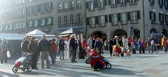 在游行的终点万森豪斯广场(Waisenhausplatz)上的信息摊位早已布置好并开始了。广场的三边展出的是法轮功学员遭到中共血腥迫害的照片和关于九评具体内容的简介。 游行队伍到达后,一个简易的“手术台”出现在广场中心,游行队伍中的那位“医生”开始模拟演示。旁边是一个矮小的笼子,一个“中共警察”将法轮功学员推搡進去。
