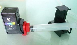 操作:连管线一起取下墨盒,在墨盒上钻孔,用胶塞塞住,轻轻一旋插入针头,保鲜膜贴在喷头上,用手轻轻抚平排除其中的空气使其紧贴喷头,将喷头压在橡胶皮上的同时用注射器抽空气,一开始抽出的墨水有泡沫,继续抽,直至看到无泡沫的墨水抽入注射器,抽出的墨水可以回收利用。拔出针头,胶塞自然密封住插针口。