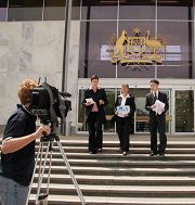 二零零六年十二月十四日上午,历时一年半的澳洲法轮功学员状告外长唐纳滥用职权签署证书、限制法轮功在堪培拉中使馆前的和平抗议的诉讼案,以被告唐纳允诺不再签发证书、支付原告法轮功学员所有的诉讼费两万澳元划下句号。
