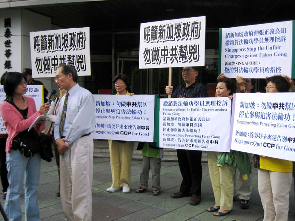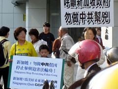本次抗议活动,法轮功学员在台北市仁爱路圆环高举展板抗议,斗大的展板,述说着台湾法轮功学员的心声:“呼吁新加坡政府勿做中共的帮凶!”参与本次抗议活动的国小三年级小朋友王建桦说,他来这里是告诉大家:新加坡政府协助中共迫害法轮功是错的!