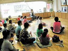 小朋友坐在露天宁谧的环境中,静心学炼能开启智慧的法轮功。