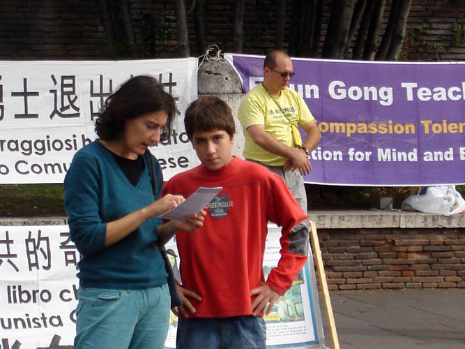 罗马法轮功学员在帝国大道讲真相,发揭露中共邪恶本质的《九评共产党》。学员通过个人及亲属的亲身经历向来往的行人及游客讲述在中国邪恶中共残酷迫害法轮功学员的详情及天灭中共的必然。许多人听了法轮功学员因坚修“真善忍”而被中共活体摘取器官深感震惊,纷纷表示愿意寄信给议员呼吁制止迫害。