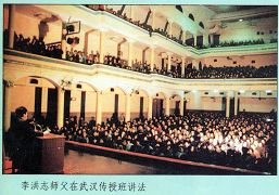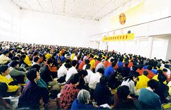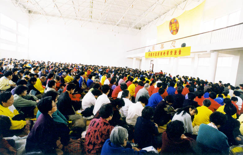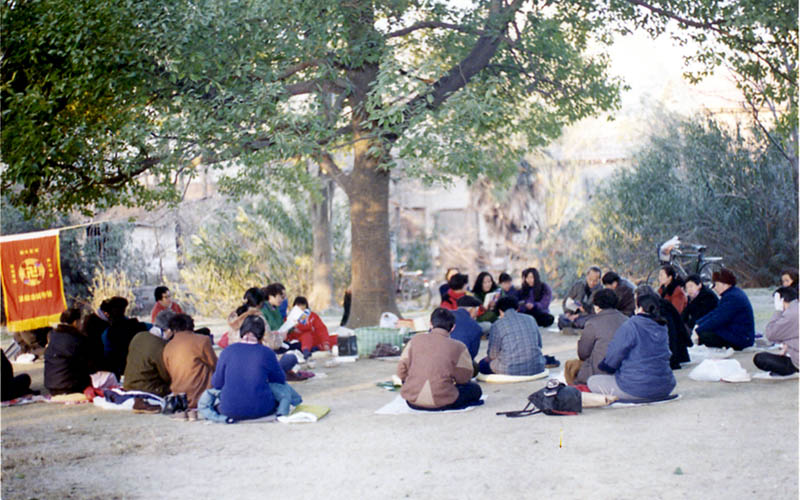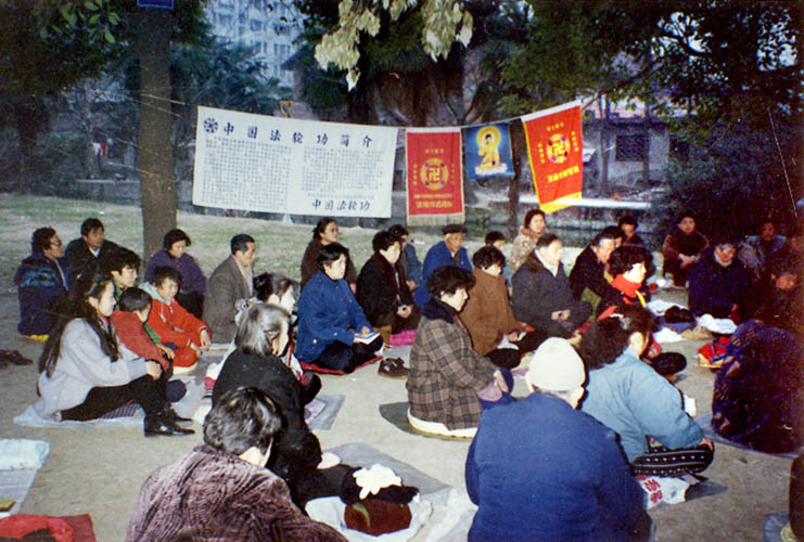 图片:九九年七二零前兰州大法弟子集体炼功学法的场面